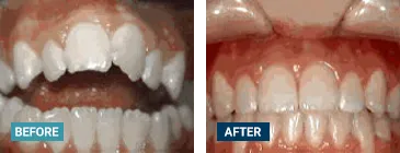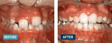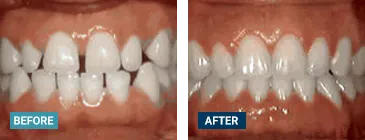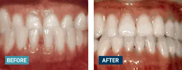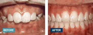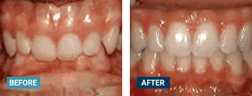 This patient's lateral incisors were congenitally missing. She had braces for 20 months to move the teeth into their correct positions, then the missing teeth were replaced with bonded "Maryland" bridges.
